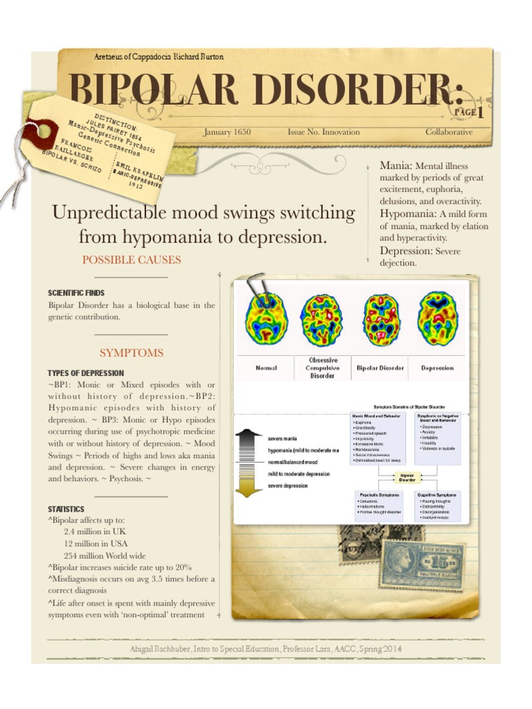 Bipolar disorder is characterised by extreme mood swings. Refers to person, place, thing, quality, etc. Like diabetes or heart disease, bipolar disorder is a. Bipolar disorder, previously known as manic depression, is a mental disorder characterized by periods of depression and periods of abnormally elevated mood that last from days to weeks each. Bipolar disorder is a mental health condition characterized by extreme shifts in mood and energy a person with bipolar disorder may experience periods of an extremely elevated or irritable mood. Bipolar disorder is a lifelong condition that runs an unpredictable course of ups and downs. Bipolar disorder is a treatable mental health condition marked by extreme changes in mood bipolar disorder was previously known as manic depression because a person's mood can alternate. Bipolar disorder, or manic depression, causes symptoms of mania and depression. Bipolar disorder is a chronic or episodic (which means occurring occasionally and at irregular intervals) mental disorder. These can range from extreme highs (mania) to extreme lows (depression). Bipolar disorder is a chronic episodic illness associated with behavioural disturbances. Sometimes they feel very happy and up. Überprüfen sie die übersetzungen von 'bipolar disorder' ins deutsch.